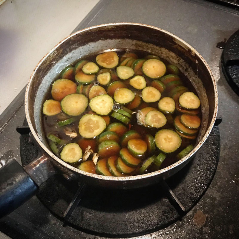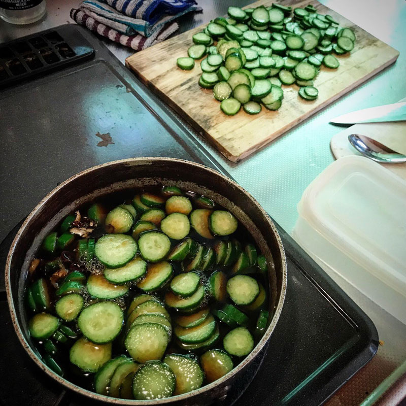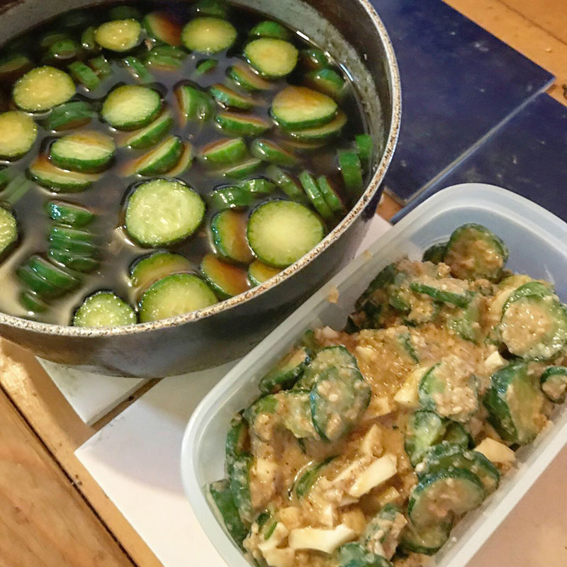 朝、調味液に漬けた自家製きゅうりのキューちゃんは調味液だけ沸騰させて再度漬け込み。これで明日の朝、完成。