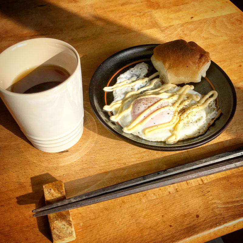 朝から美味しいものいろいろ仕込んだ。いつもは抜いてる朝食も。半熟トロトロ目玉焼きとベーコンエピ。紅茶。