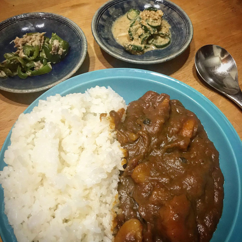 木曜日はカレー曜日。先日、海老を塩焼きで食べた時の殻から出汁をとってトマト煮にしたものにカレーを入れて。カレーでも負けずに感じられる海老の旨味。すごいな。