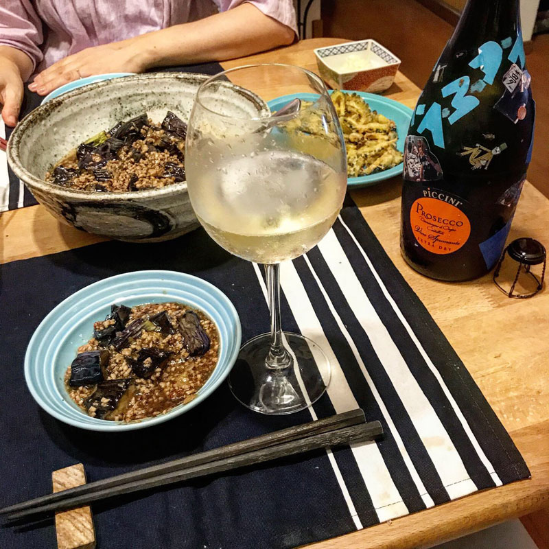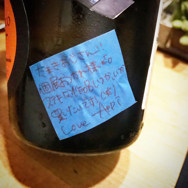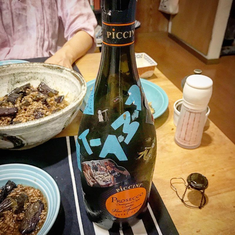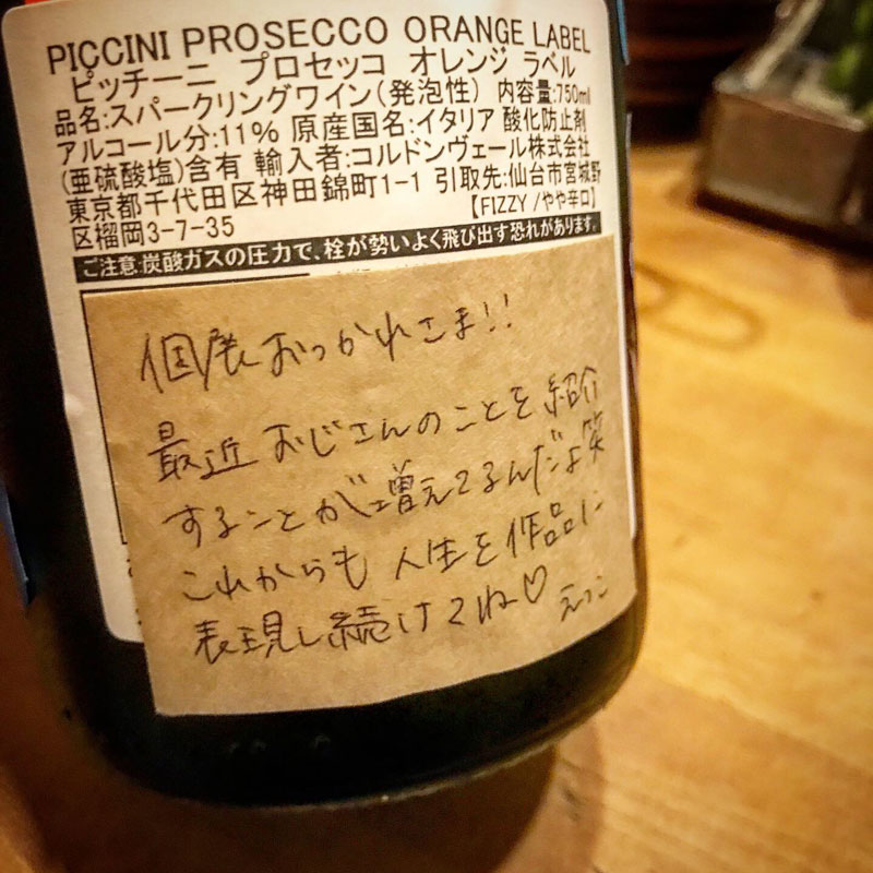 昨年の個展の後、年末に姪っ子企画で家族みんなのメッセージが書かれた発泡ワインをお祝いでもらったのを開けて幸せに美味しい。