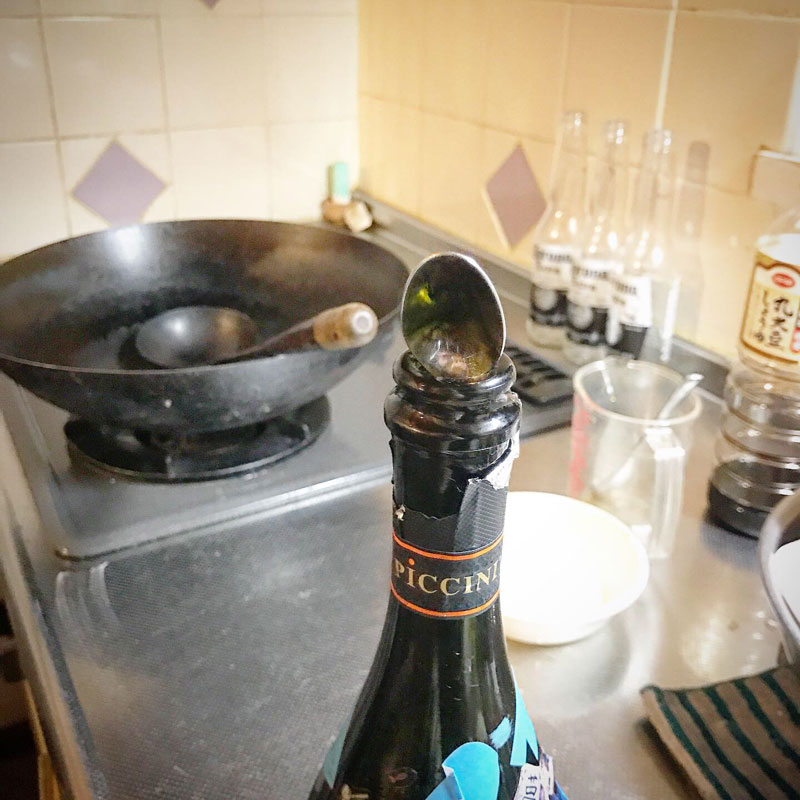 発泡ワインは炭酸が飛ばない様に銀のスプーンを口に挿して冷蔵庫に。また明日。