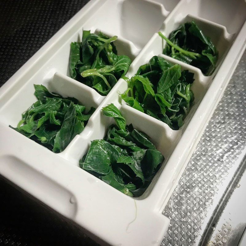 製氷皿でキューブ状に凍らせる。旬以外でも食べられるように。