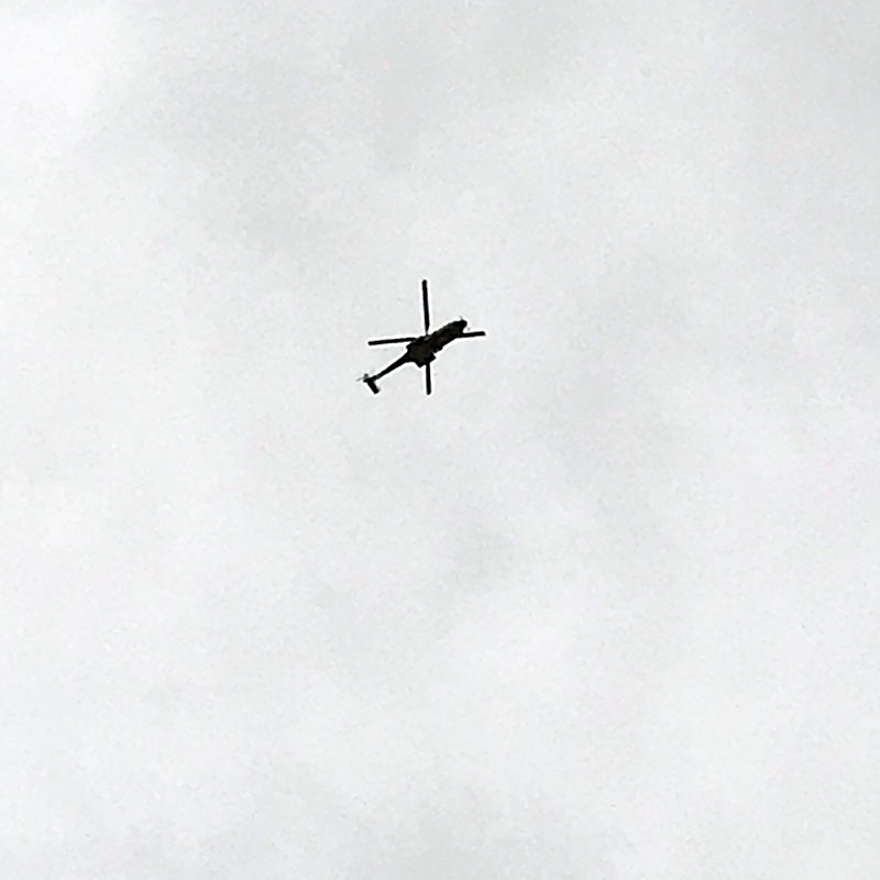 庭の上を低空で飛んでいくヘリコプター。なんだ?