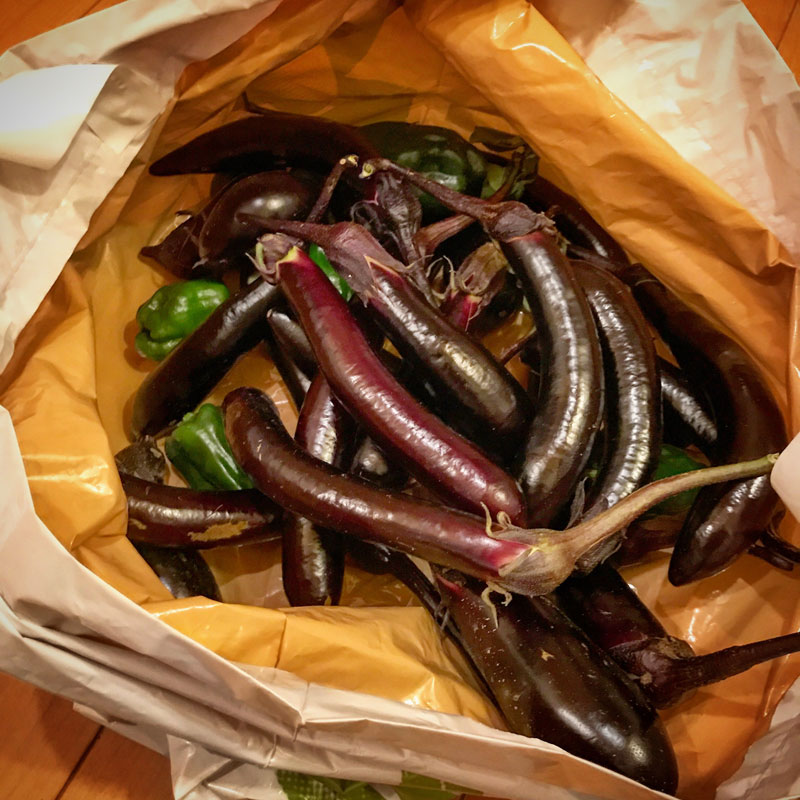 仕事を終えて帰宅したら玄関先に山の様な茄子とピーマン。今年、うちの畑はナスが不作だったのでありがたい。本当に野菜ってほとんど買わないよなぁ。いただくか作るかで。感謝、感謝。