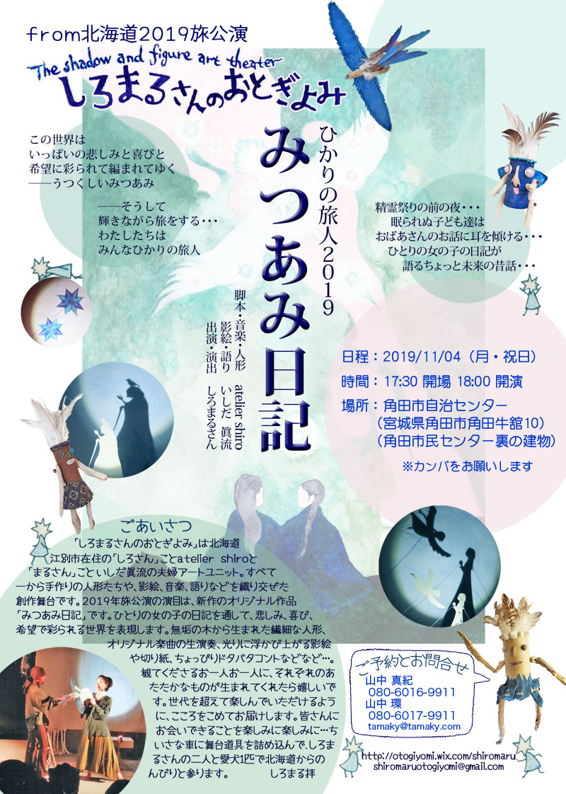 北海道の友だち、しろさんとまるさんのおふたりが今年も来月から2019旅公演で本州にやってくる。「しろさんのおとぎよみ」と銘打たれた創作舞台。物語、音楽、人形、影絵など全ておふたりの手作り。歌と語りもおふたり。それはそれはていねいに作られた世界。去年の仙台での舞台にとても感激して今年は僕らの住んでいる街でも一公演打っていただく様にカミさんを中心に準備をしています。今、玄関のコルクボードには僕の個展としろまるさんのおとぎよみの公演のお知らせをピンナップしてあります。