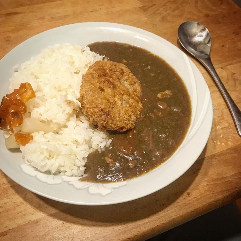 カレーライスにセブンイレブンの牛肉のコロッケ乗せて。