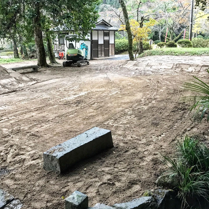 境内にも水が細く流れるところがあるけど大雨で大量の水が流れて土砂を持って行かれたのか、山砂を運んで重機で補修していた。