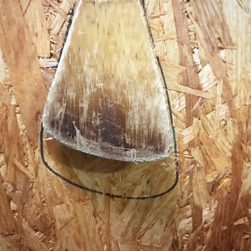 13年前に引っ掛けた時に油性マジックで輪郭をなぞっていたのでこの13年間でどれだけ木べらが減ったかわかる。この減った分は僕たちの胃の中に消えたって事だな・笑