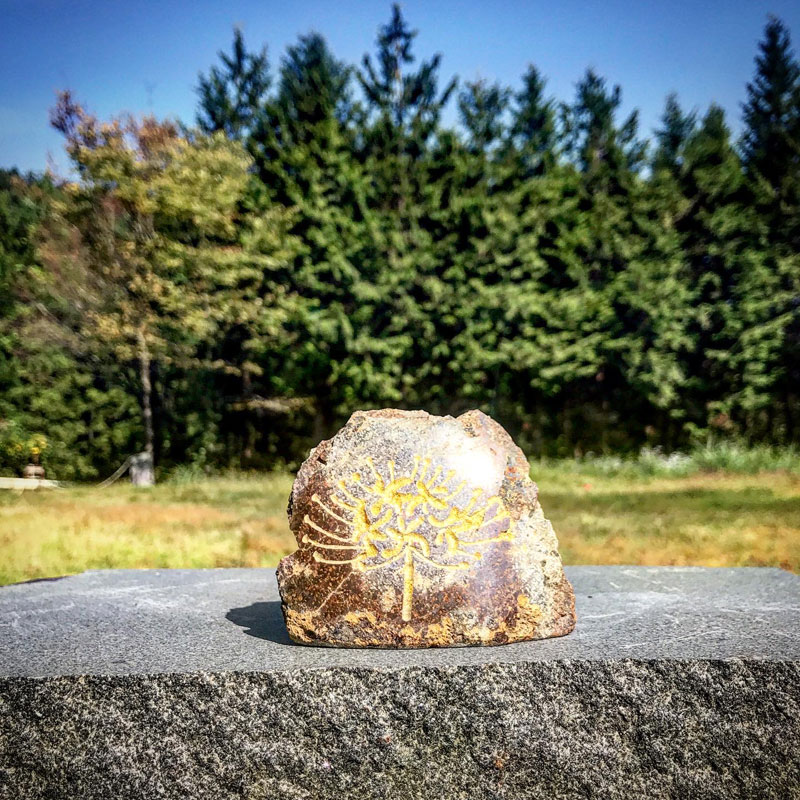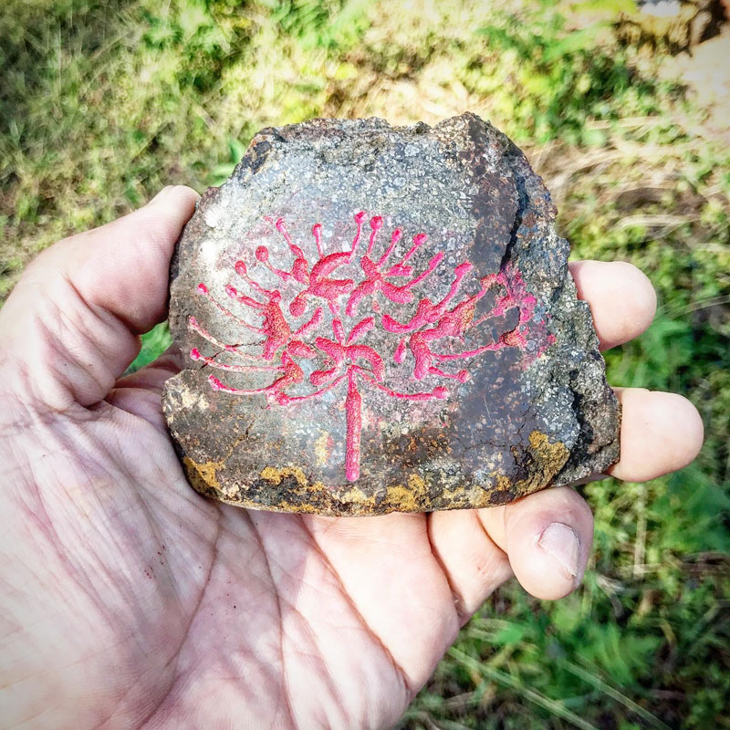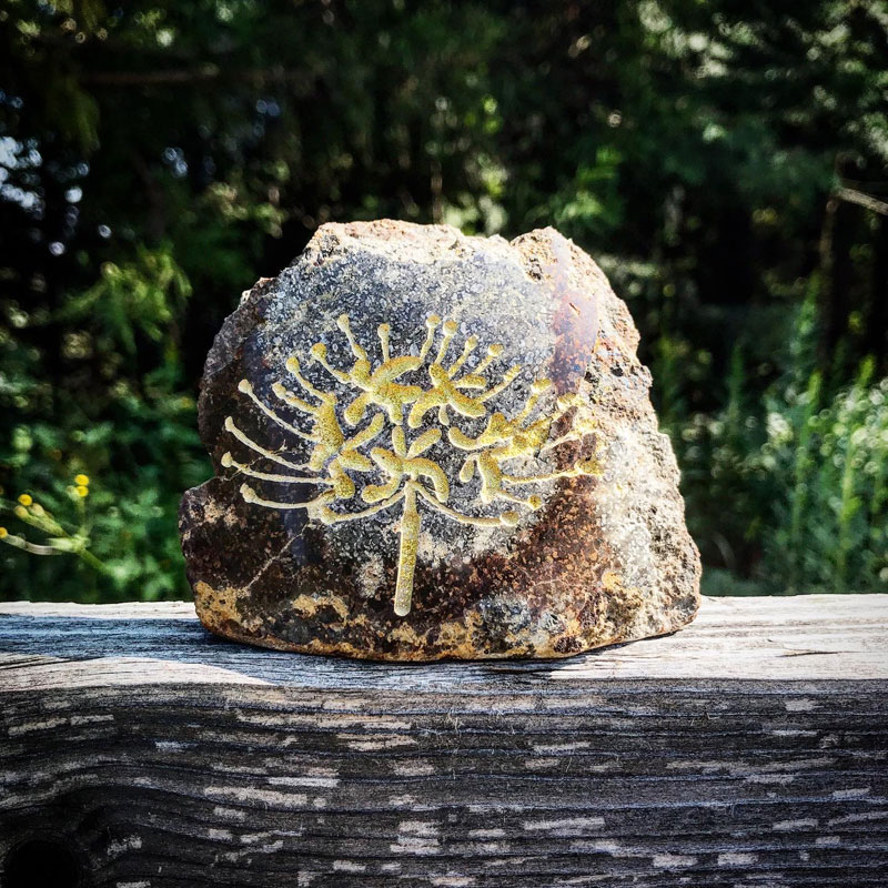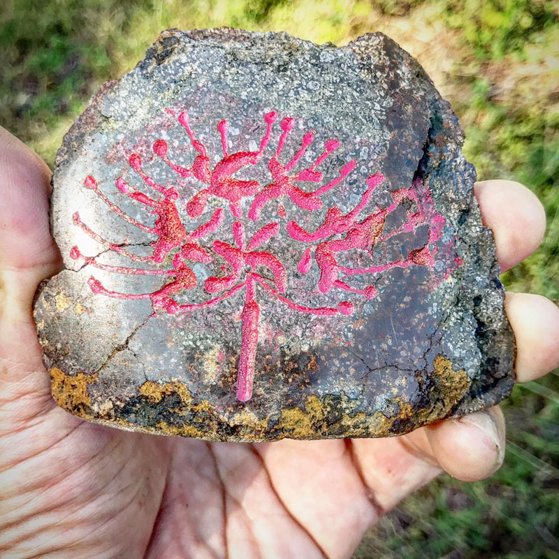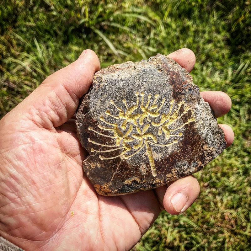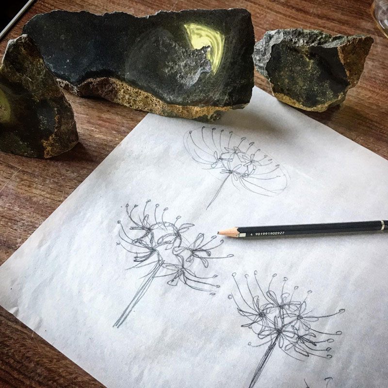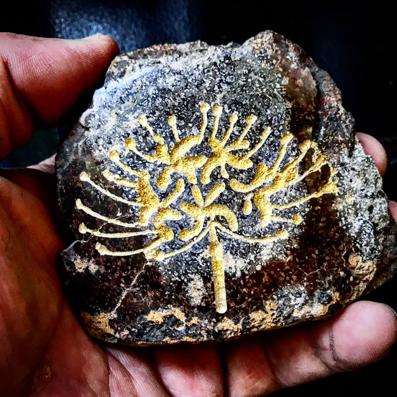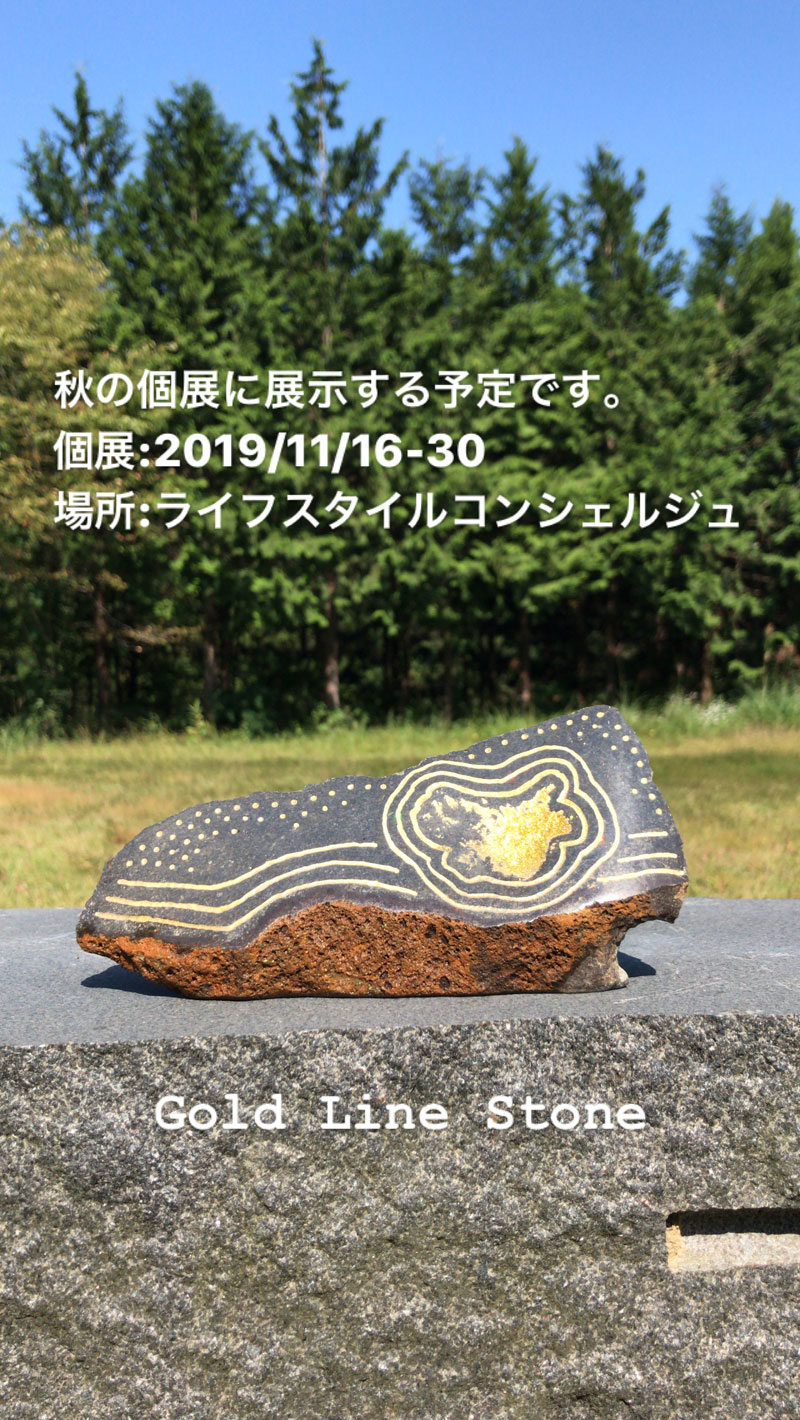伊達冠石の泥様部分の茶色い色と金色が響き合い、磨かれた黒を背景に金色が立ち上がる。伊達冠石だからこそ成立している。他の石で同じことをやってもダメだろう。この伊達冠石を割って削って泥様部分を残しながら磨いて、そこに線や模様を彫って金色に着色する作品を「金線石」と名付けました。このシリーズの名前ずっと考えてて昨日、突然思いついたので・笑
