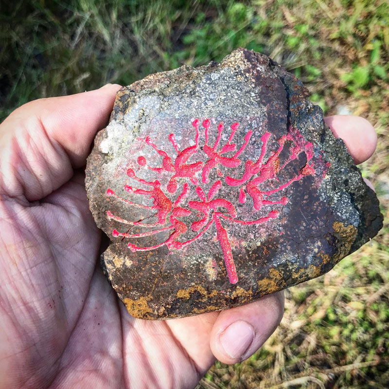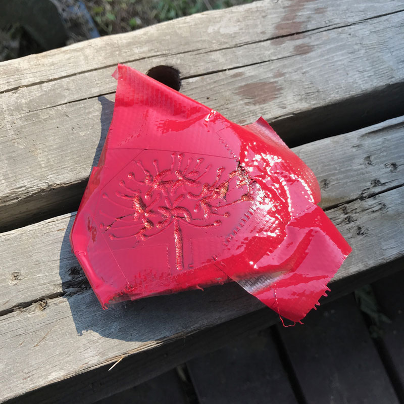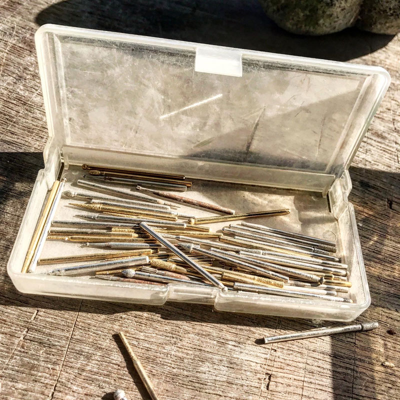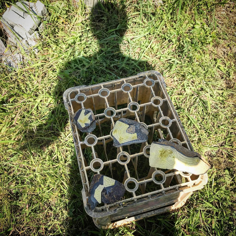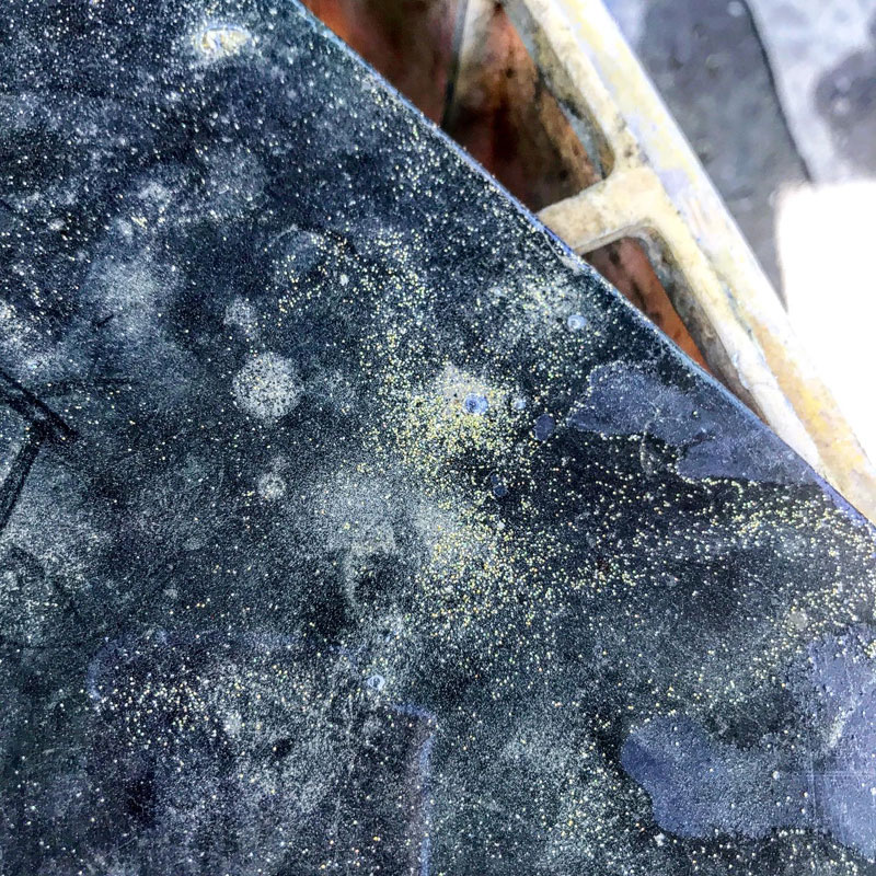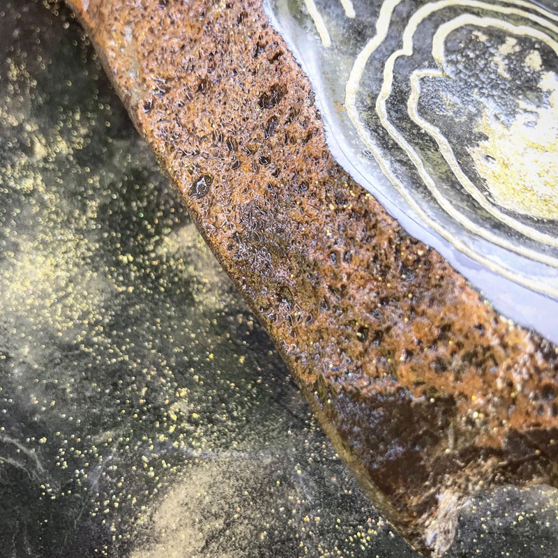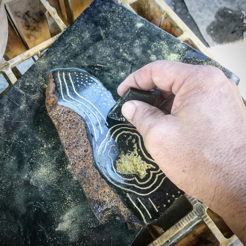 金の塗装と金ラメ加工した後、塗料で覆われた石を砥石で研ぎ出して再び金のラインを浮かび上がらせるんだけど、その時に線に入りきれなかった金ラメが大量にとれてしまう。