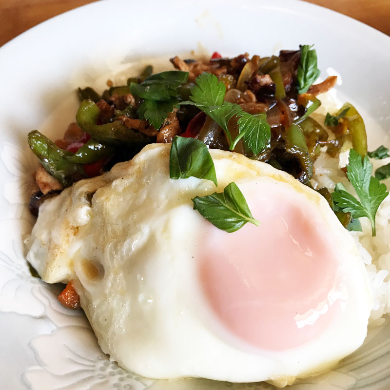昼飯にカミさんがガパオライス、作ってくれた。うまー!