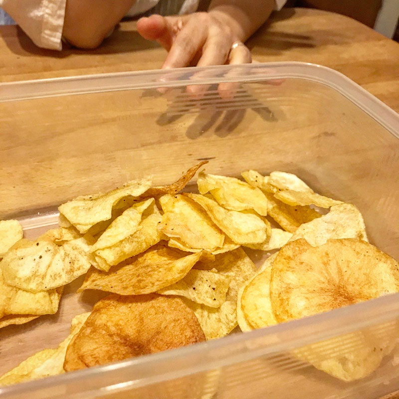 なんとなくお腹いっぱいにならず、一昨日作った自家製ポテトチップスもつまむ。きちんと揚げてると乾燥剤入れてないタッパーでもしけないんだよ。4、5日たっても。ちゃんと作れてないと翌日には食べられたもんじゃなくなるのに。不思議。