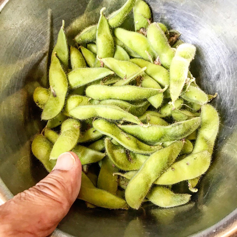 居酒屋我家、開店。畑の秘伝豆抜いて茹でた。