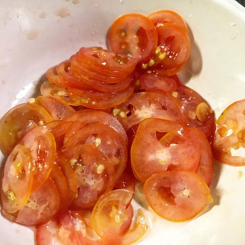 代わりといってはなんだけど畑の固めのミニトマトを極薄にスライスして投入。