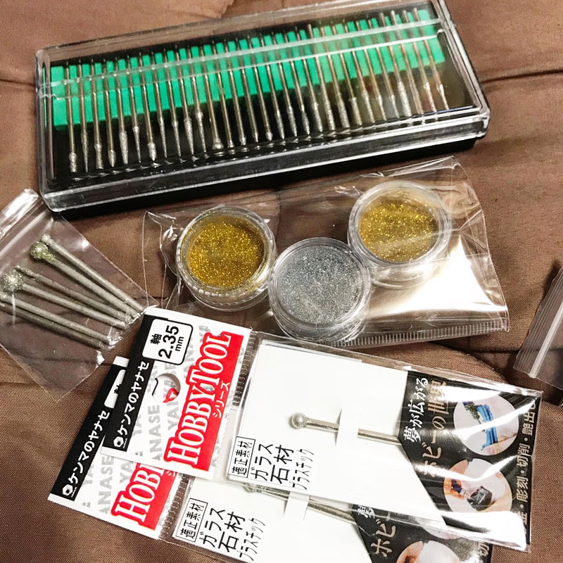 ルーターに取り付けるダイヤのポイント、金ラメ。銀ラメも買ってみた。塗料も一口に金色と言っても使える金色と使えない金色があるから買ってみないとわからない。