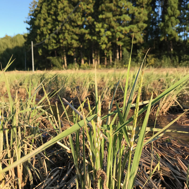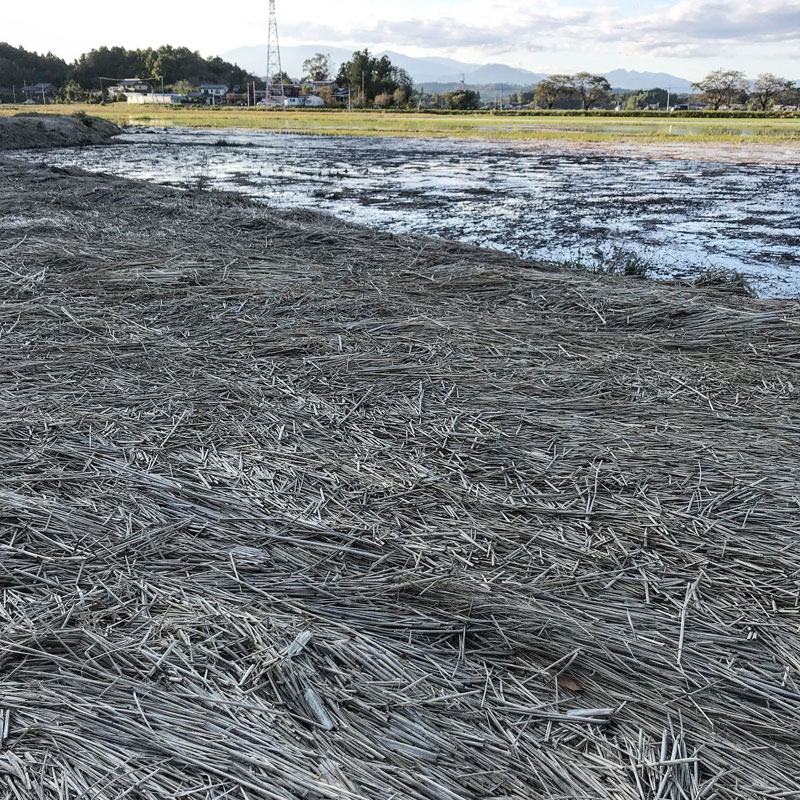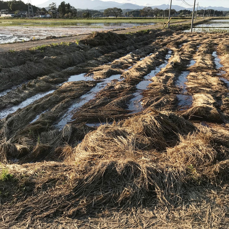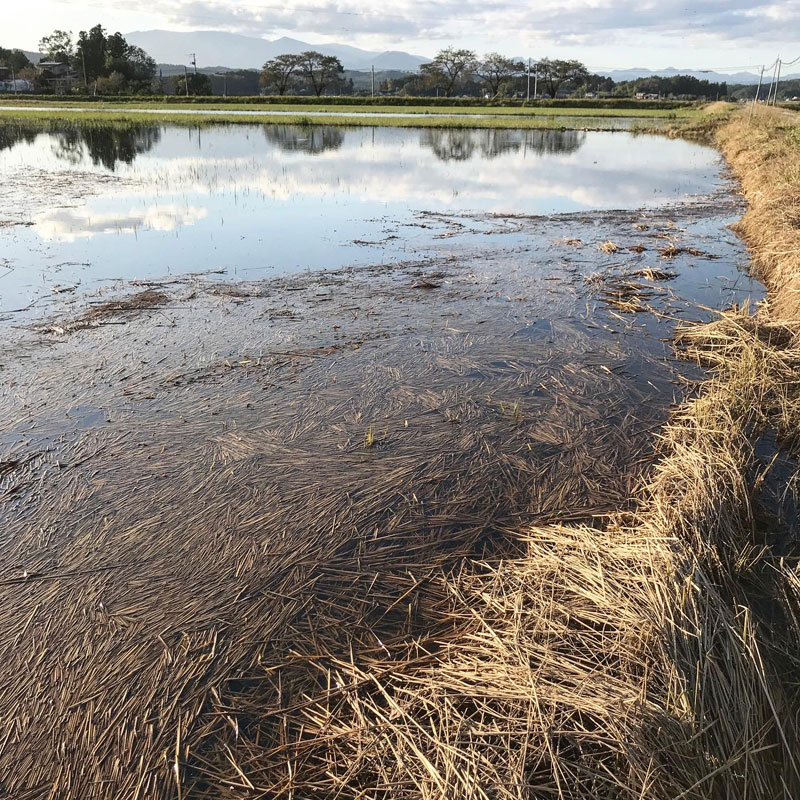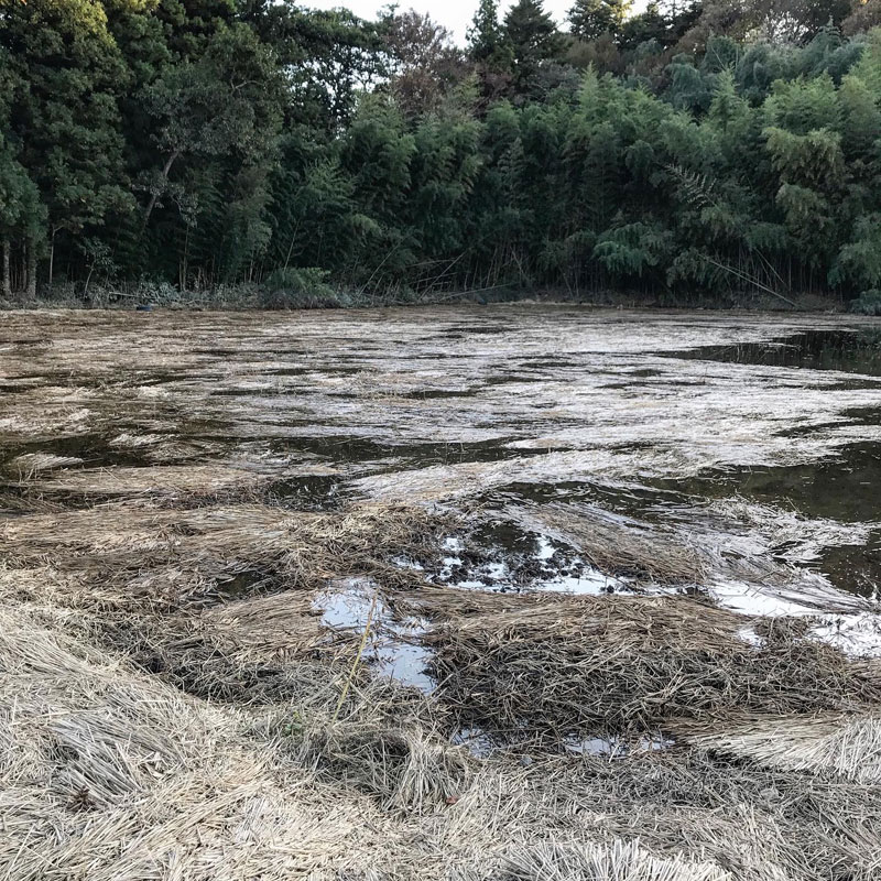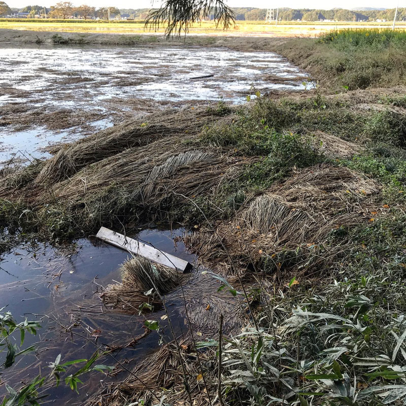 田んぼでは台風による数日間の冠水とその後の豪雨でまだ水分がたっぷりで、ひこばえ(稲刈りをした後の株に再生した稲)が青々と茂っている。