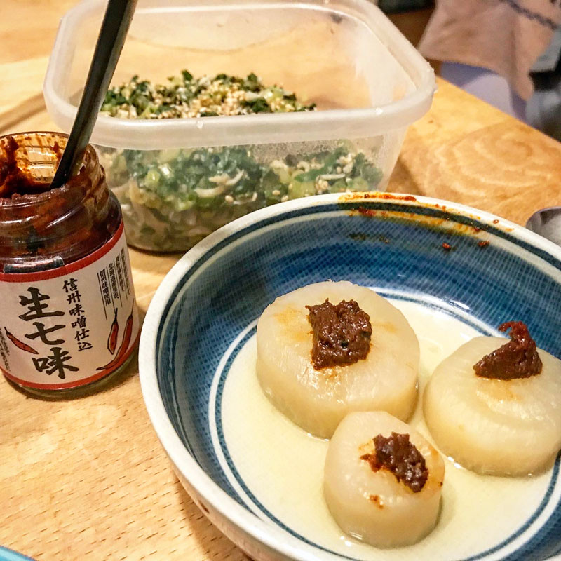 ふろふき大根を生七味で。最近これにハマってる。大根葉の炒め。白菜の甘酢漬け。大根の実と葉の味噌汁。