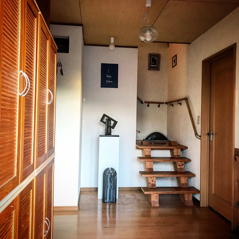 個展は明日まで。玄関にたくさんの作品展示台が戻ってくる。滅多にないスッキリした玄関の写真を撮っておこう。