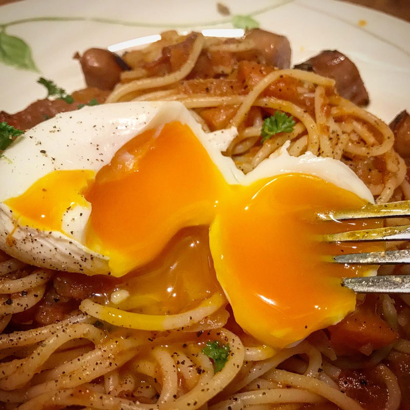 たくさん作ったミネストローネの最後。今宵もパスタで。煮込まれて濃厚になってたミネストローネに一塩して和えて。粗挽きソーセージのソテーとポーチドエッグをトッピング。