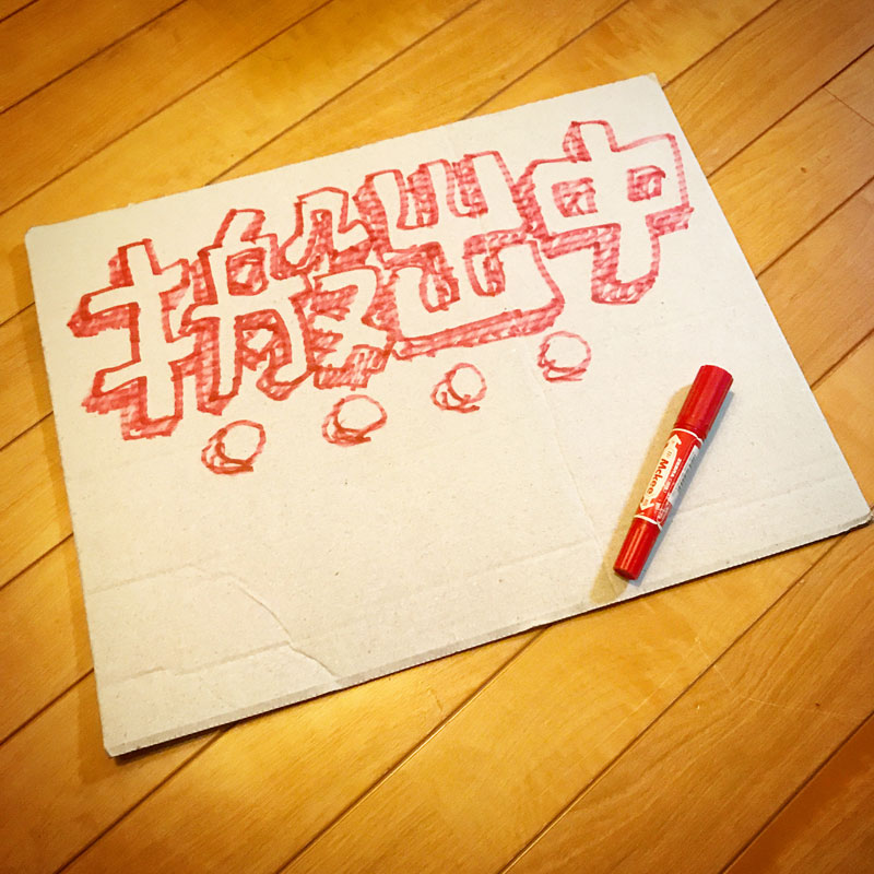 明日の個展搬出、もしかしたら繁華街で短時間路駐になるかもしれないのでプレート書いた。