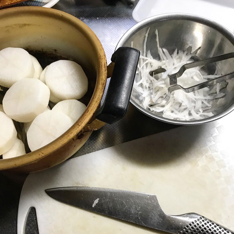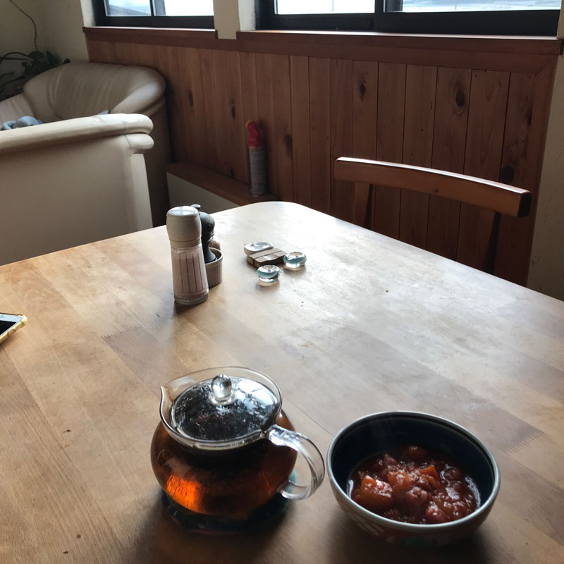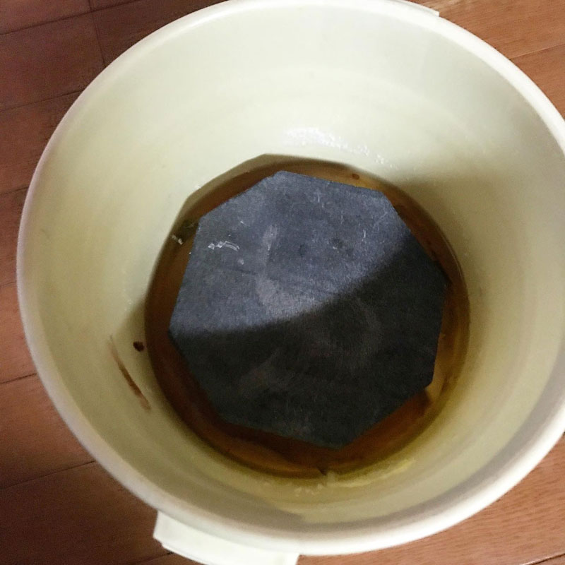 近所の方にいただいた白菜で昨日の夕方仕込んだ白菜漬け。今日の客人に食べさせてあげたくて重石3つ重ねたら一晩で水が上がってくれた。