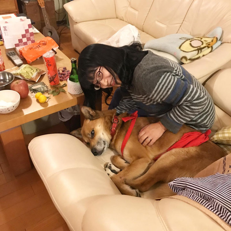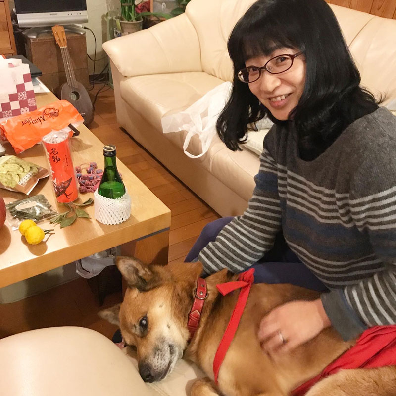 そしてカミさんはおふたりの愛犬あすぱらに癒やされてる。
