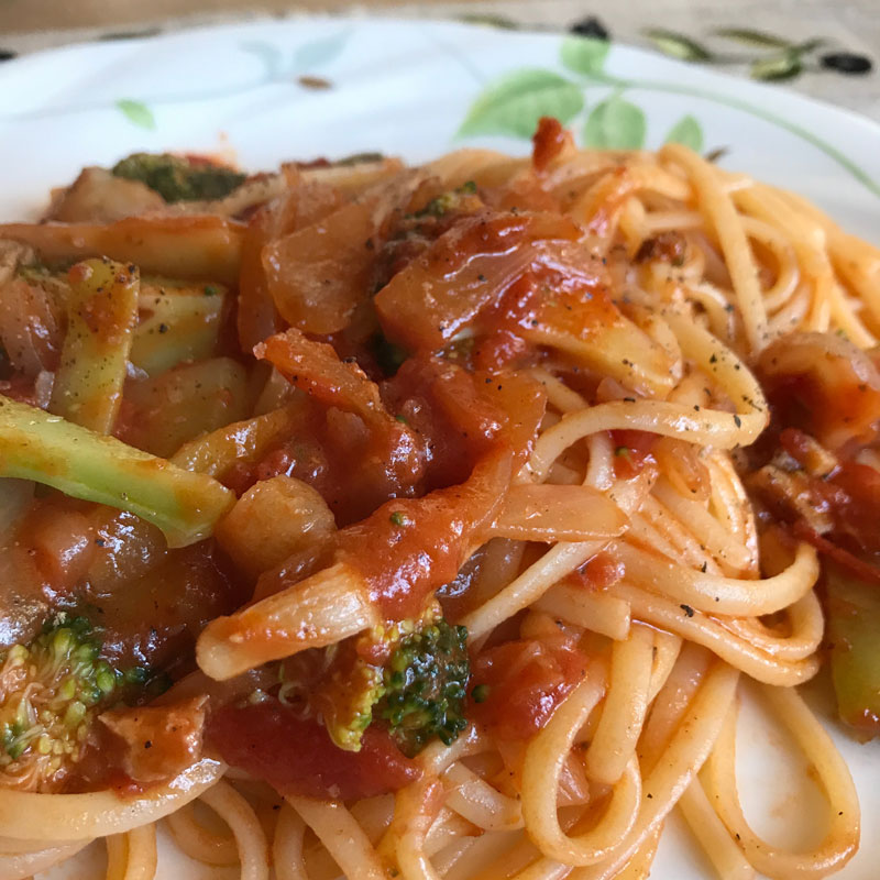 昨晩の鶏肉のトマトが返信して今日のランチのパスタに。