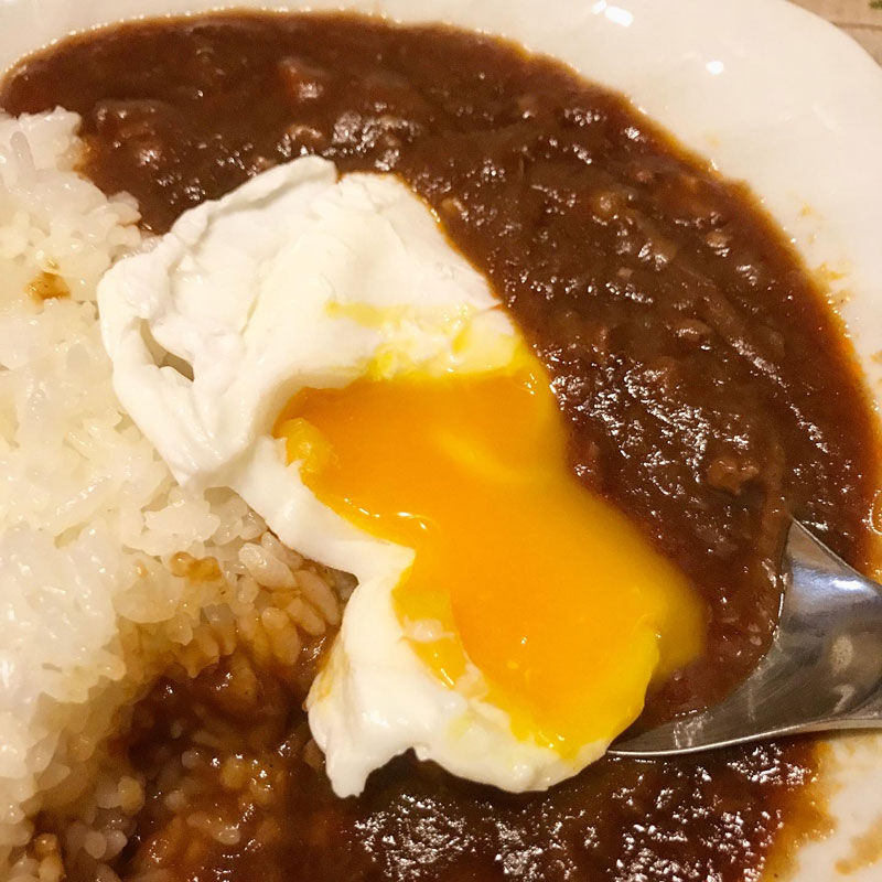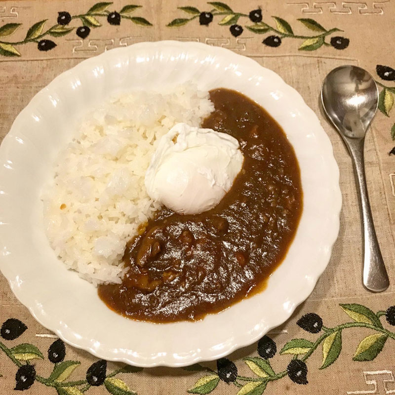 木曜日はカレー曜日。今日はカレーではなくハヤシライス。ポーチドエッグ乗せて。