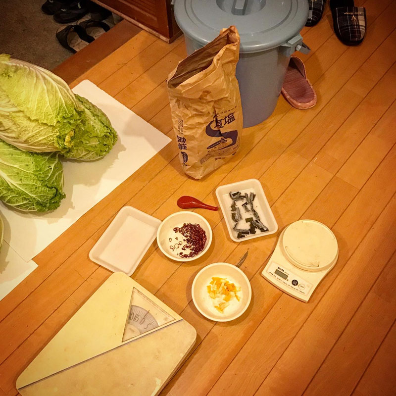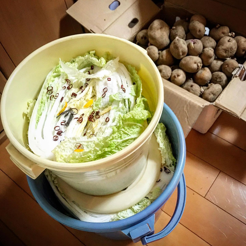 大きな漬け樽は別の用途に使ってしまってるのでふた樽使っても白菜3つしか漬けられなかった。