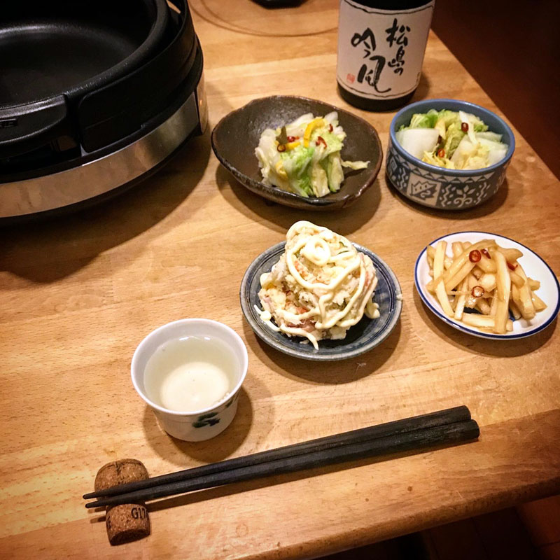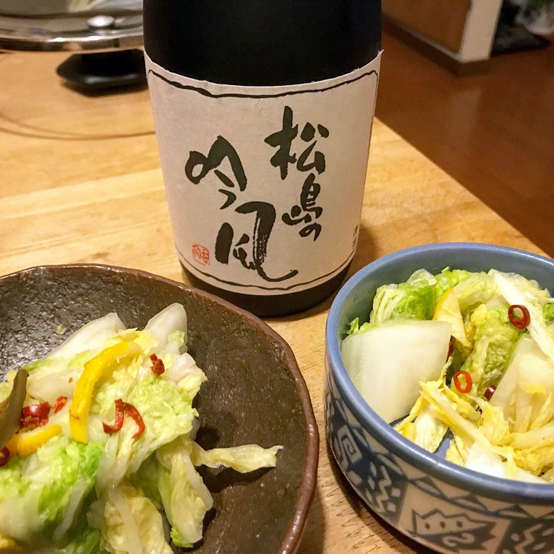 漬け上がったばかりの白菜漬け、ポテトサラダ、辣白菜をあてに。たまたまこの酒菜、どれも自分で作っものだった。