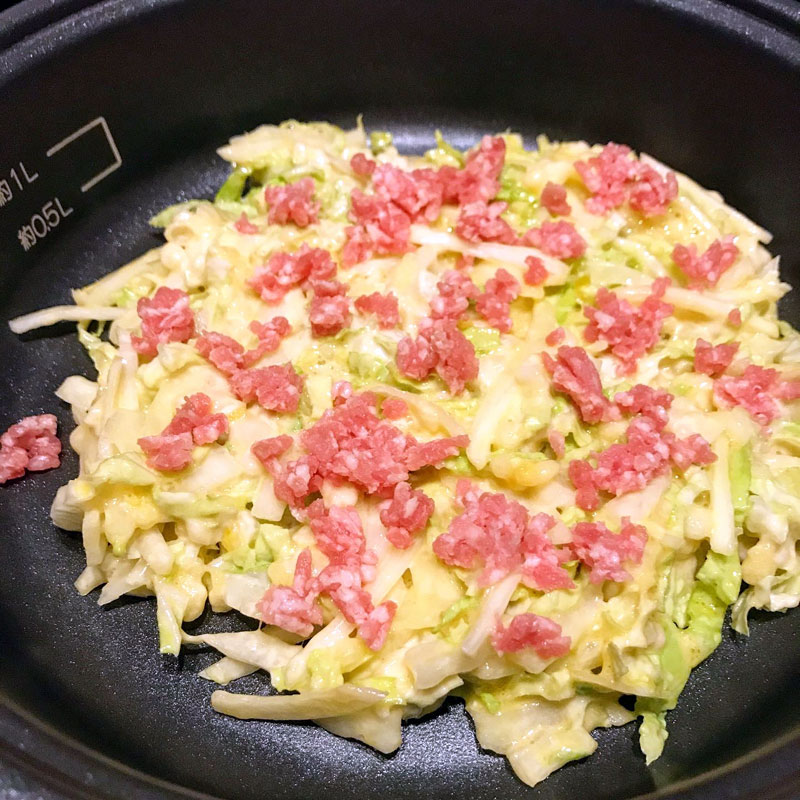 ホットプレートでも切り分けやすい挽肉を使った広島のお好み焼きの府中焼。