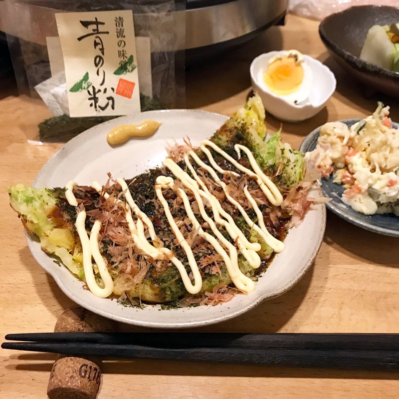 自宅の音楽教室のレッスンが終わってカミさんがお好み焼き焼いてくれる。居酒屋我家、開店。