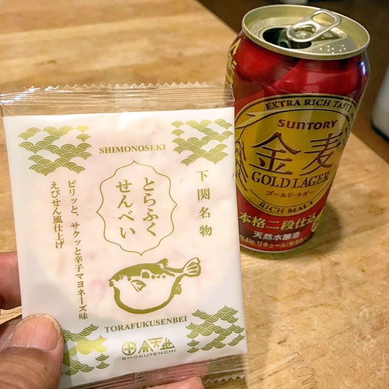 山口旅行のお土産、とらふくせんべいで金麦。これ絶対お茶より日本酒かビールのお供として作ってると思う。ビールに美味しい。ごちそうさま!!