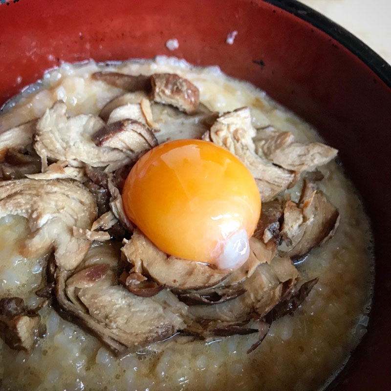 卵かけご飯に鳥肉の土鍋煮を乗せた