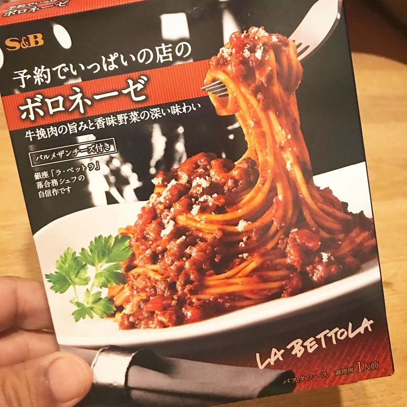 即席のパスタソースで美味しいと思った事あんまり無いんだけどこれは美味しかった!エスビーからでてる銀座「ラ・ベットラ」落合務シェフのボロネーゼ。