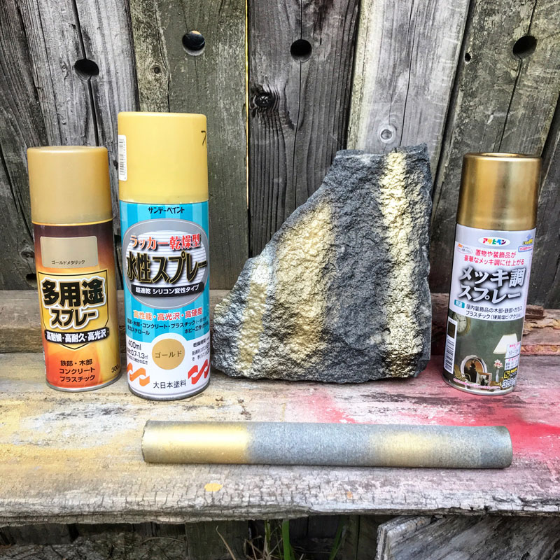 石の塗装に使う金のスプレーの色テスト。気に入っていたスプレーもう売ってない。一口にゴールドと言ってもかなり違う。良い色ほど店頭から消えるのは何故?