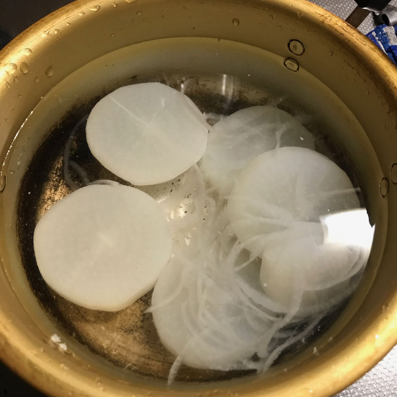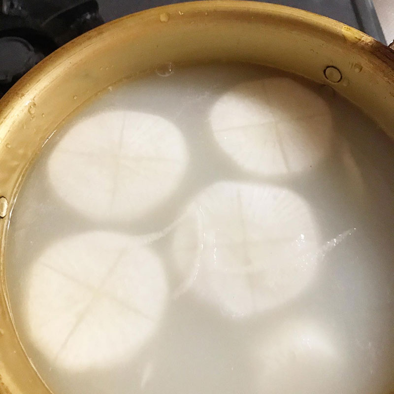 冷蔵庫に大根があったので、明日ふろふき大根で食べられるように煮ておく。いつもは米をひとつかみ入れて炊いてるけどちょうど米を研いだところだったので米の研ぎ汁で。