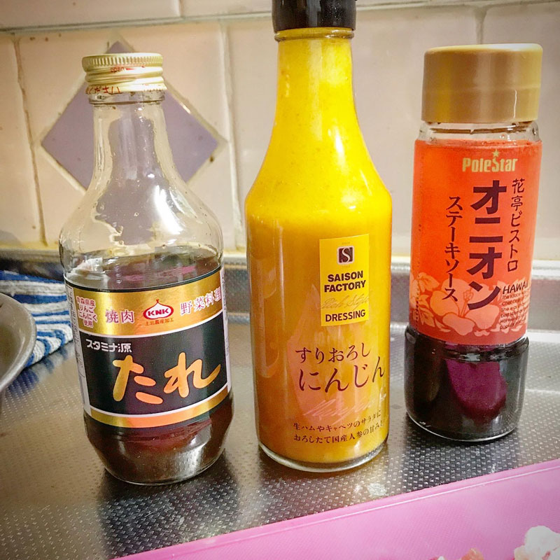 いただきもののオニオンのステーキソースとすりおろしニンジンのドレッシングがあったのでそれらを混ぜて味付けしてみたら