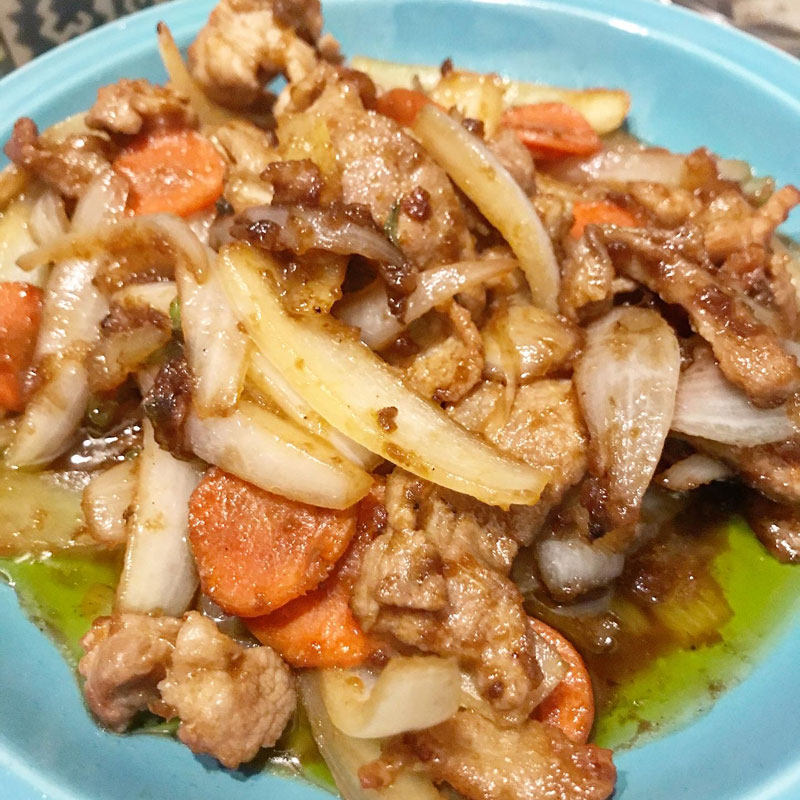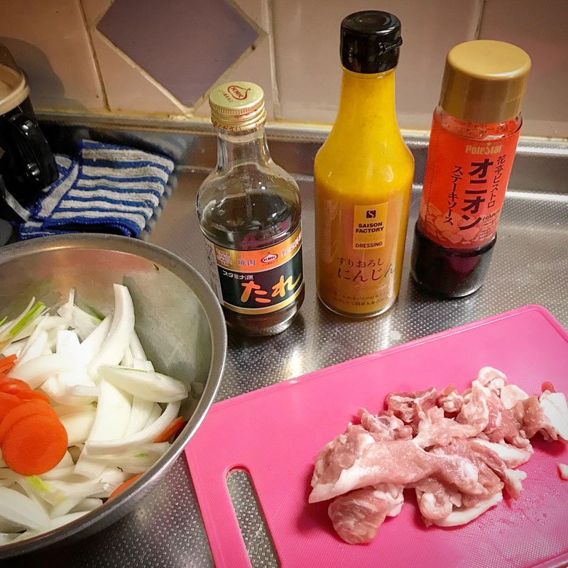 豚肉とタマネギとニンジンをスタミナ源たれでさっと炒めようと思ってたけど、