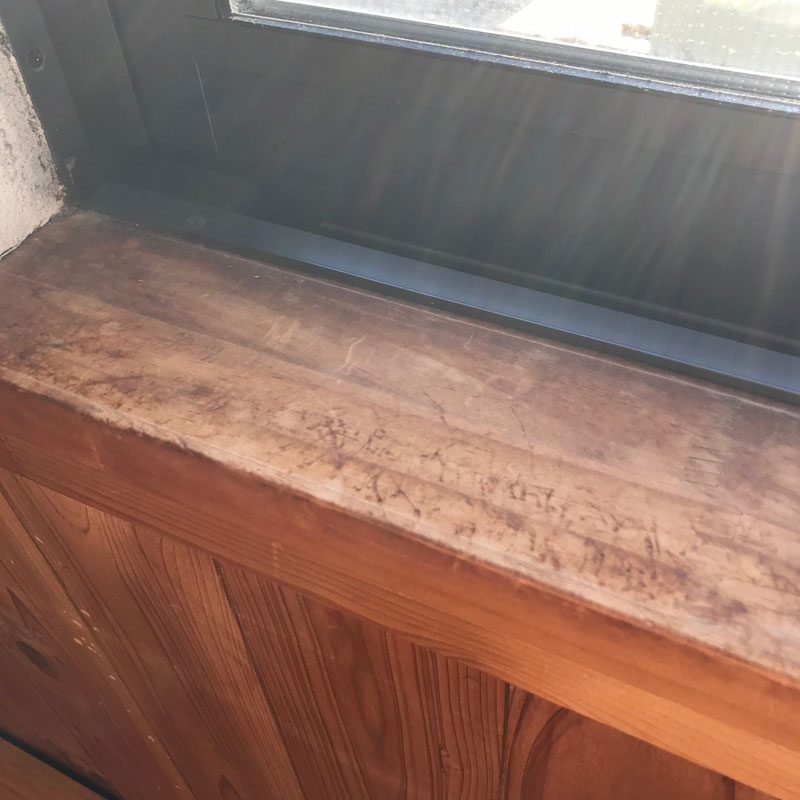 窓の桟に残る小春の爪痕。