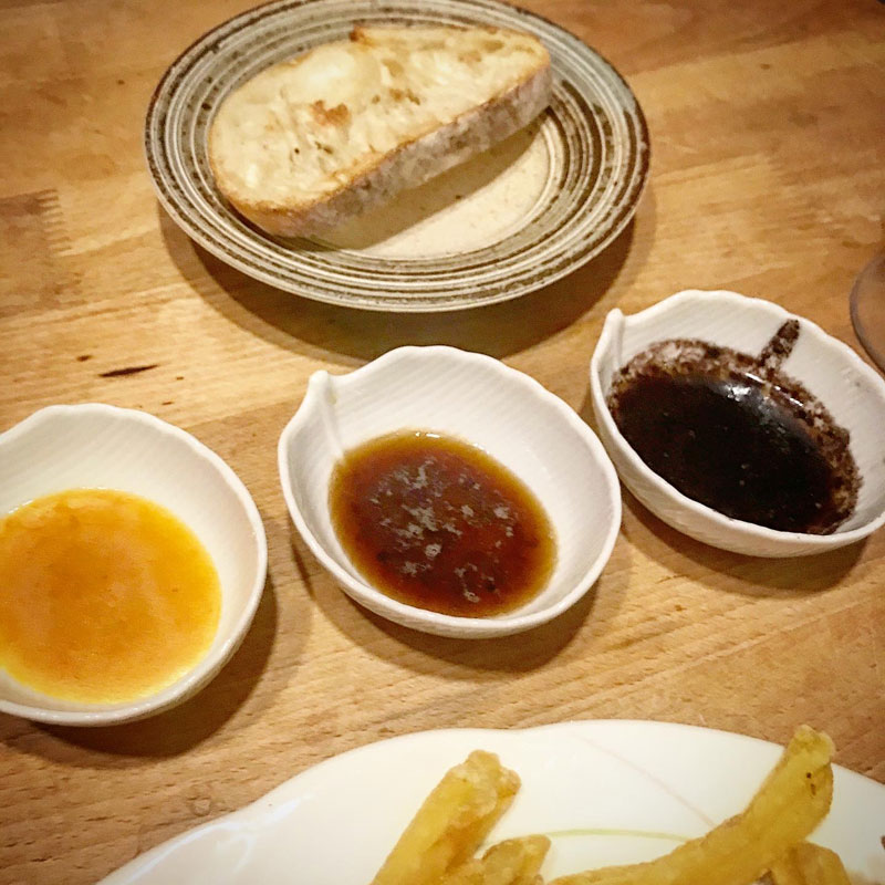 フライパンに残った肉汁にワインと醤油とバターを加えたソース、花亭ビストロのオニオンステーキソース、SAISON FACTORYのすりおろしにんじんで味変しながら楽しむ。