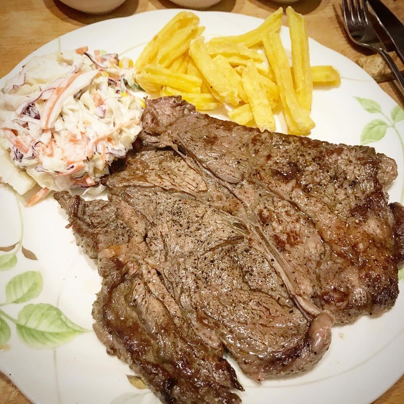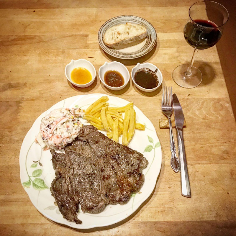 たまーにガッツリ肉を食べたくなる。塩胡椒して丁寧に焼いたステーキ。コールスロー、フライドポテト。