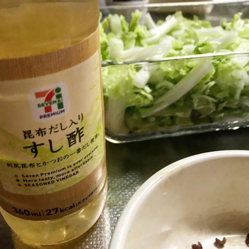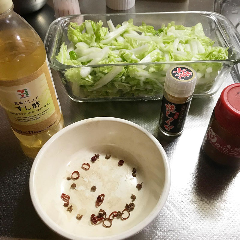 耐熱容器に塩して水気切ったらすし酢かけてしまう。これお手軽でいい。いちいち甘酢作るより。