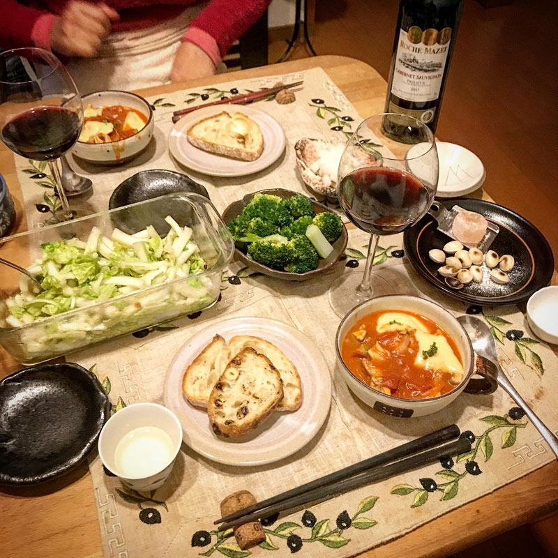 赤ワインを用意してくれて。んー、赤ワインでいただく天然酵母のパン美味しすぎ。