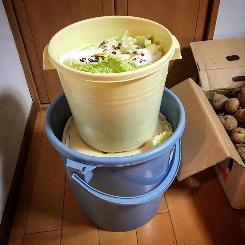 白菜の漬け方、いろいろあって半分に切って半日から一日、干してから漬けるって結構一般的だけど僕は一刻も早く水が上がって早くに塩水に漬かった方が味の面でも腐敗防止の面でも良いと思ってるので今は一切干さない。というか逆に出来るだけ新鮮で瑞々しいのを漬けて初日はかなり重石を重くして少しでも早く水が上がるようにしてる。まあ、これからも少しずつ改良しながら漬けるのが楽しみ。