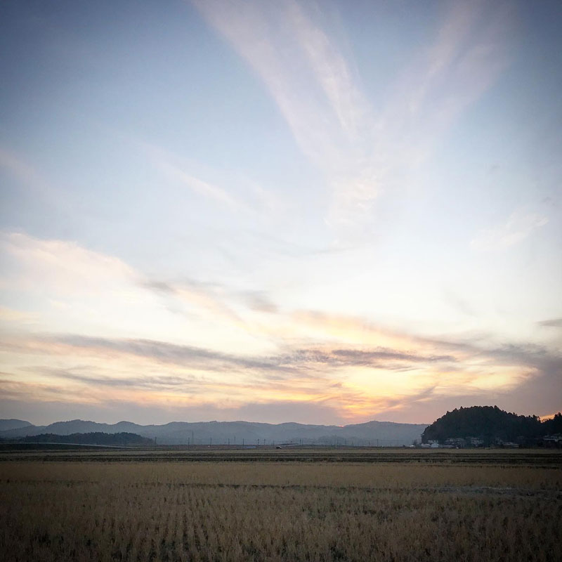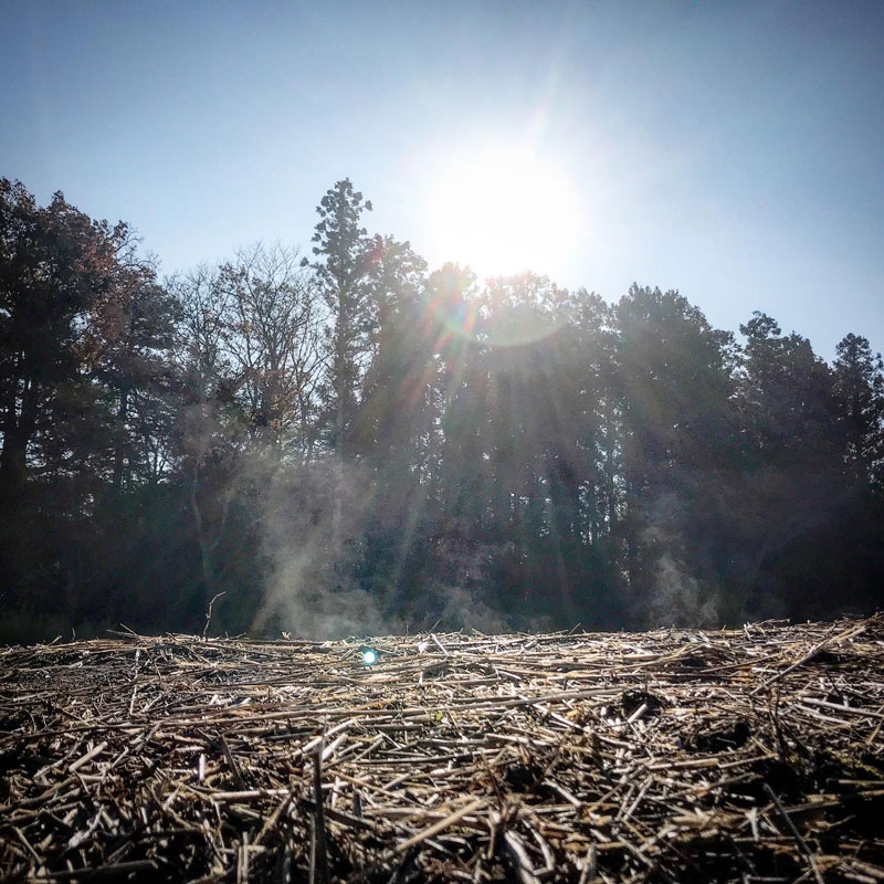 田んぼの霜が太陽に温められて立ち昇る。