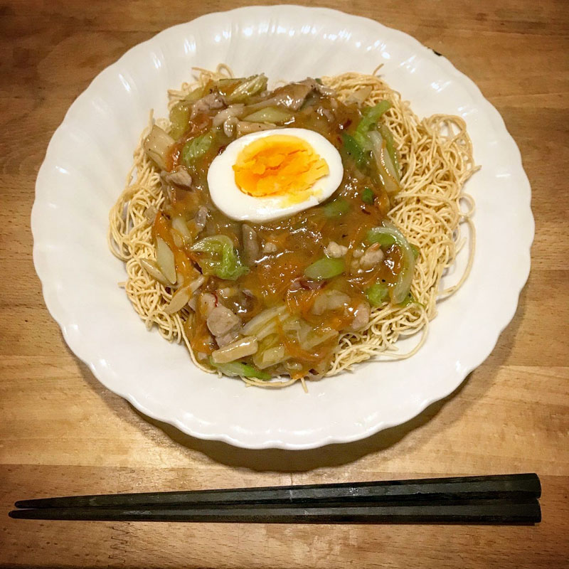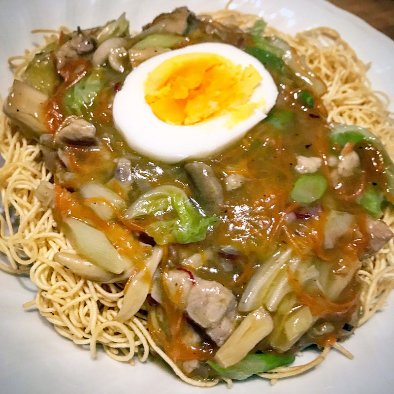 白菜メインで後は豚肉、にんじん、長ネギ、エリンギ、茹で卵。片栗粉でトロミつけたら揚げた麺かけて出来上がり。