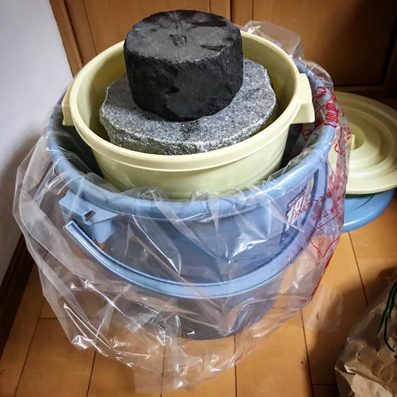 昨日、仕込んだ自家製白菜のチェック。2段積みにした小さい方の樽も大きい方の樽もどちらも白菜の上面ギリギリまでもう水が上がっている。