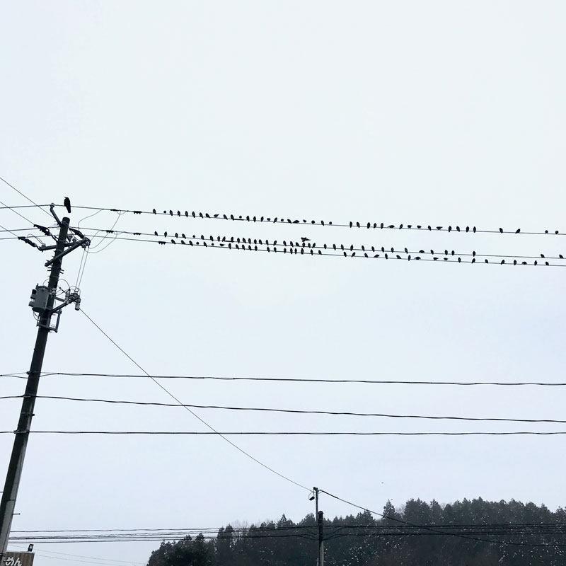 コンビニ前の電線に鳥が並んでる。ベチョベチョ雪では行き場ないもんな。わかるー。