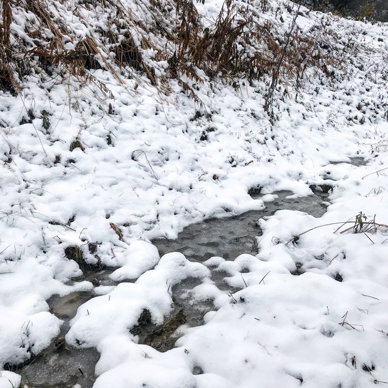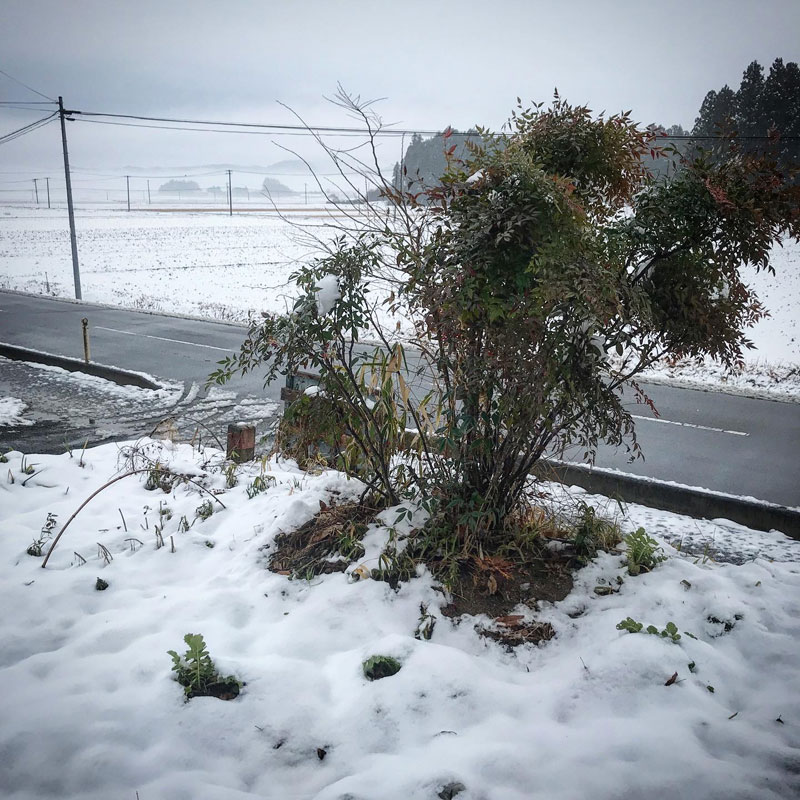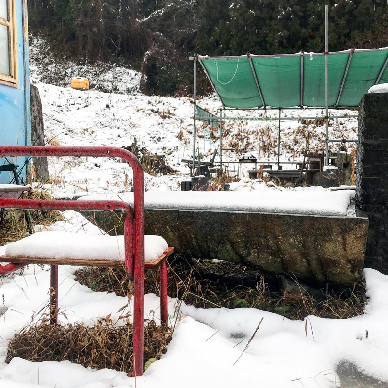玄関からの景色。例年に比べると気持ち悪いくらいに温かい冬を象徴するように早朝なのに雨に変わった雪。雪かきや石彫りに一番厄介な重い雪だ。